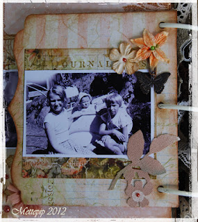 Denne siden har jeg laget selv med tynn kartong inni. Brukt kantdies fra Tim Holtz for å en fin form i kanten. Ramme fra Kort & Godt er svertet og pyntet med halvperler. Pyntet med Resistent Canvas fra Prima som er sprayet med Glimmermist, en stor Primablomst og en perlepynt. Den store rosa sommerfuglen er en rub-on fra Prima.